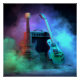 Two vibrant electric guitars - one in earthy tones, another in emerald blue - rest elegantly alongside an amplifier, creating an immersive musical atmosphere. The contrast between the instruments and the dark surroundings evokes passion and creativity, perfect for music lovers seeking visual inspiration.