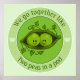 Juntos, dentro a cápsula verde são duas ervilhas adoráveis. Cada ervilha tem pontos para os olhos e um sorriso alegre. Ao redor da cápsula estão vinhas e folhas verdes. O design é colocado dentro a um círculo verde. À volta das bordas superior e inferior estão as palavras "vamos juntos como duas ervilhas numa vagem" em letras verdes.