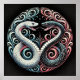 Duas serpentes estilizadas, uma branca e uma preta, se entrelaçando em uma composição circular. As serpentes devem ter expressões ferozes e estar rodeadas por desenhos florais ornamentados em tons suaves de azul e rosa. O fundo deve ser escuro, realçando as cores vivas e dando um sentimento cósmico, refletindo temas de dualidade e equilíbrio.