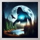 Poster com Pé Grande com dupla exposição de árvores, rio, águia e lua de cheio.