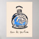 Eau de parfum slogan de perfume francês com uma ilustração de moda de uma obra de arte original do artista Sacha Grossel de uma garrafa de perfume de safra azul. Esta ilustração aquarela de um perfume de marca de luxo está no estilo de pop e a cor de fundo é personalizável.