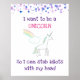Um poster com desenho de unicórnio. Uma nuvem fofa no final de um arco-íris no fundo. A aquarela rosa e púrpura confunde a borda superior. O texto diz: "Quero ser um Unicórnio para que possa apunhalar idiotas com a cabeça. Engraçado, elegante e fofo.