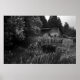 Uma vedação de madeira velha cria uma linha dianteira para um prédio abandonado. Poster preto-e-branco.