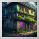 Edifício abandonado pós-apocalíptico com grafite roxo e verde e crescimento excessivo de plantas. Decadência urbana, espaços perdidos arte de IA.