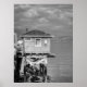 Traga um clima costeiro tranquilo para o seu espaço com esta fotografia em preto e branco de um edifício de cais de madeira sobre águas tranquilas. A composição destaca linhas arquitetônicas simples contra nuvens texturizadas e uma costa silenciosa, criando um sentimento atemporal e minimalista que funciona lindamente em interiores modernos.