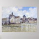 Alfred Sisley. Edifícios e pontes com água em primeiro plano; igreja à esquerda do centro. Paisagem com um rio profundo. Há pequenas casas e uma catedral na margem do rio. Há duas pontes com arcos do outro lado do rio. Pequenas nuvens estão correndo através do céu azul. Reprodução de famosas imagens de arte no dominio público.