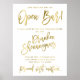Dourado e branco Nosso Casamento Tem Um Sinal de Bar Aberto (poster) com efeito de folha de ouro (faux, impresso como uma imagem). As dimensões do impressão de sinal (poster) são de 18 por 24 polegadas.