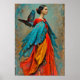 "Elaris" - Penas de se tornar. Enrolado na plumagem da mudança, esta poderosa figura veste transformação como armadura. Os tons vermelhos e azuis vívidos e as texturas que fluem falam de libertação através da evolução. Cada dobra e flauta revela sua jornada da forma à liberdade, força à suavidade, mulher à asa.