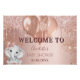 Para um Chá de fraldas elegante. Um fundo de aparência metálica falsa rosa dourado. Decorado com rosa dourado, pingos de brilho de falso rosa, aparência de pingar tinta, gotas de brilho, balões e um elefante para bebês. Personalize e adicione nomes e data. Perfeito tanto como um banner de boas-vindas quanto como decor do partido.