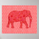 Imagens digitais mistas de um elefante contra fundo arabesque tiled - Padrão de flores em tons de vermelho profundo a vermelho coral com fundo vermelho e branco de coral