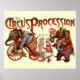 Circo Vitoriano - Elefantes e Palhaços. Imagem antiga de um circo - Ir ao circo costumava ser a grande noite fora nos velhos tempos. O circo foi divertido para a família. Esta imagem de circo é uma imagem vintage de uma antiga procissão de circo, quando os artistas caminhavam pelo círculo e acenavam na plateia. A procissão do Circo começa com um elefante andando de bicicleta, e vestida como uma criança. Bastante feito! Depois vêm os palhaços e homens com chapéus grandes e bandeiras antigas. Trazer a retaguarda da procissão de circo é outro grande elefante, andando sobre duas pernas segurando seu fã japonês, um chapéu, bengala, e vestido como um verdadeiro cavalheiro vitoriano. A ilustração é em cor de cheio, com grande título lido que diz: A procissão de circo. Vermelho, azul, laranja e amarelo são as cores proeminentes na ilustração. Sobre a procissão Circus Uma procissão circense através da rua principal das cidades, antes que o topo grande se instale que reúne multidões de circos. A ilustração, O Circo Procissão, foi o cobrir de um antigo livro infantil impresso em 1888 pelos Irmãos McLoughlin de Nova York.