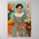 Uma pintura vibrante, ao estilo vintage de uma mulher enpoçada num vestido listrado preto-e-branco, sentado entre dois arranjos florais coloridos e frutas frescas. A cena irradia o charme com cores ousadas, pinceladas expressivas e uma estética nostálgica e postada que lembra Matisse.