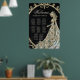 Elegância em ouro e preto. Composição cativante que combina elegância e mistério. O foco está em uma mulher com um vestido fluente, sua silhueta brilhando em ouro brilhante contra fundo preto profundo. O corvo simboliza mistério e inteligência e reforça a atmosfera mística da design. Nas proximidades floresce uma rosa vermelha, cuja cor vibrante representa paixão e beleza. Uma combinação de escuridão e luz, elegância e mistério
