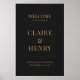 Welcome your guests in timeless luxury with this elegant black and gold wedding welcome sign. Featuring rich black tones, shimmering gold accents, and refined typography, this design perfectly complements formal, evening, and black-tie weddings. Ideal for display on an easel at your ceremony or reception entrance, or as part of your event décor. Personalize easily with your names, wedding date, and venue details — a print-ready design that adds sophistication and glamour to your celebration.