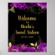 Pretty birthday welcome sign with purple flowers and gold foliage. The words can be changed to suit your own details or requirements. Would be perfect for a sweet sixteen birthday party.