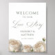 Modern stylish wedding welcome sign, with elegant watercolor floral sage greenery and dusty white garden roses, elegant modern hand drawn calligraphy. Classy and elegant, soft and modern sign