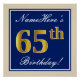 Este design simples e bolsa mensageifesta de aniversario elegante apresenta uma mensagem personalizada, como "NameHere's 65th Birthday!" (com o "65º" a ter um aspecto de cor dourada falsa/imitação), dentro de uma área quadrada de cor azul com um contorno de fronteira simples. O nome está em um texto elegante, de cor branca, parecido com script, e pode ser personalizado. Uma poster personalizada como esta poderia talvez ser usada como decoração em uma festa para alguém que comemora seu sexagésimo quinto aniversário. [~Z0000239]