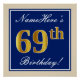 Este design simples e bolsa mensageifesta de aniversario elegante apresenta uma mensagem personalizada, como "NameHere's 69th Birthday!" (com o "69º" a ter um aspecto de cor dourada falsa/imitação), dentro de uma área quadrada de cor azul com um contorno de fronteira simples. O nome está em um texto elegante, de cor branca, parecido com script, e pode ser personalizado. Uma poster personalizada como esta poderia talvez ser usada como decoração em uma festa para alguém que comemora seu sexagésimo nono aniversário. [~Z0000239]