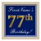 Este design simples e bolsa mensageifesta de aniversario elegante apresenta uma mensagem personalizada, como "77º Aniversário do Primeiro Nome!" (com o "77º" a ter um aspecto de cor dourada falsa/imitação), dentro de uma área quadrada azul com um contorno de fronteira simples. O nome está em um texto elegante, de cor branca, parecido com script, e pode ser personalizado. Uma poster personalizada como esta poderia talvez ser usada como decoração em uma festa para alguém que comemora seus setenta e sete anos. [~Z0000239]
