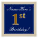 Este design simples e bolsa mensageifesta de aniversario elegante apresenta uma mensagem personalizada como "primeiro aniversario do nome-aqui!" (com as "1ruas" com aparência falsa/imitação de cor dourada) dentro de uma área quadrada de cor azul com um contorno de fronteira simples. O nome está em um texto elegante, de cor branca, parecido com script, e pode ser personalizado. Uma poster personalizada como esta poderia talvez ser usada como decoração em uma festa para alguém que comemora seu primeiro aniversário. [~Z0000239]