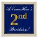 Este design simples e bolsa mensageifesta de aniversario elegante apresenta uma mensagem personalizada, como "segundo aniversário de ANameHere!" (com o "segundo" com aparência de cor falsa/imitação em forma de ouro), dentro de uma área quadrada de cor azul com um contorno de borda simples. O nome está em um texto elegante, de cor branca, semelhante a script, e pode ser personalizado. Uma poster personalizada como esta poderia talvez ser usada como decoração em uma festa para alguém que comemora seu segundo aniversário. [~Z0000239]