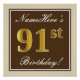Este design simples e bolsa mensageifesta de aniversario elegante apresenta uma mensagem personalizada como "NameHere's 91rua Birthday!" (com a "91rua" com um olhar falsa/imitado de cor dourada) dentro de uma área quadrada de cor castanha com um contorno de fronteira simples. O nome está em um texto elegante, de cor branca, parecido com script, e pode ser personalizado. Uma poster personalizada como esta poderia talvez ser usada como decoração em uma festa para alguém que comemora seu 90º aniversário. [~Z0000240]