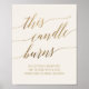 Este elegante sinal de "vela queima" de caligrafia a ouro em marfim é perfeito para um casamento simples. O design neutro apresenta um cartaz minimalista decorado com tipografia romântica e caprichosa em folha de ouro falsa.