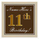 Este design simples e bolsa mensageifesta de aniversario elegante apresenta uma mensagem personalizada como "Aniversário do 11 do Nome-Aqui!" (com o "11" a ter um aspecto de cor dourada falsa/imitação) dentro de uma área quadrada de cor castanha com um contorno de fronteira simples. O nome está em um texto elegante, de cor branca, semelhante a script, e pode ser personalizado. Uma poster personalizada como esta poderia talvez ser usada como decoração em uma festa para alguém que comemora seu décimo primeiro aniversário. [~Z0000240]