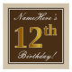 Este design de poster simples e bolsa mensageifesta de aniversario elegante de apresenta uma mensagem personalizada como "NameHere's 12 Birthday!" (com o "12" com um aspecto de cor dourada falso/imitado) dentro de uma área quadrada de cor castanha com um contorno de fronteira simples. O nome está em um texto elegante, de cor branca, semelhante a script, e pode ser personalizado. Uma poster personalizada como esta poderia talvez ser usada como decoração em uma festa para alguém que comemora seu décimo segundo aniversário. [~Z0000240]
