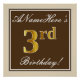 Este design simples e bolsa mensageifesta de aniversario elegante apresenta uma mensagem personalizada como "ANameHere's aniversário de 3 anos!" (com o "3º" com um aspecto de cor dourada falsa/imitação) dentro de uma área quadrada de cor castanha com um contorno de fronteira simples. O nome está em um texto elegante, de cor branca, semelhante a script, e pode ser personalizado. Uma poster personalizada como esta poderia talvez ser usada como decoração em uma festa para alguém que comemora seu terceiro aniversário. [~Z0000240]