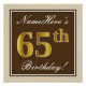 Este design de poster simples e bolsa mensageifesta de aniversario elegante apresenta uma mensagem personalizada como "NameHere's 65th Birthday!" (com o "65º" com um visual falsa/imitado de cor dourada) dentro de uma área quadrada de cor castanha com um contorno de fronteira simples. O nome está em um texto elegante, de cor branca, parecido com script, e pode ser personalizado. Uma poster personalizada como esta poderia talvez ser usada como decoração em uma festa para alguém que comemora seu sexagésimo quinto aniversário. [~Z0000240]