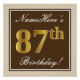 Este design simples e bolsa mensageifesta de aniversario elegante apresenta uma mensagem personalizada como "NameHere's 87th Birthday!" (com o "87º" a ter um aspecto de cor dourada falsa/imitação) dentro de uma área quadrada de cor castanha com um contorno de fronteira simples. O nome está em um texto elegante, de cor branca, semelhante a script, e pode ser personalizado. Uma poster personalizada como esta poderia talvez ser usada como decoração em uma festa para alguém que comemora seu oitenta e sétimo aniversário. [~Z0000240]