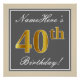 Este design simples e bolsa mensageifesta de aniversario elegante apresenta uma mensagem personalizada como "NameHere's aniversário de 40 anos!" (com o "40º" com um aspecto de cor falsa/imitação em forma de ouro) dentro de uma área quadrada colorida de cinza com um contorno de fronteira simples. O nome está em um texto elegante, de cor branca, semelhante a script, e pode ser personalizado. Uma poster personalizada como esta poderia talvez ser usada como decoração em uma festa para alguém que comemora seu quadragésimo aniversário. [~Z0000241]