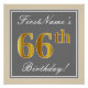 Este design simples e elegante de cartaz de festa de aniversário apresenta uma mensagem personalizada como "Aniversário de 66 anos de FirstName!" (com o "66º" tendo uma aparência de coloração dourada falsa/imitada) dentro de uma área quadrada de cor cinza com um contorno de borda simples. O nome está em um texto elegante com aparência de letra cursiva de cor branca e pode ser personalizado. Um cartaz de festa de aniversário personalizado como este pode ser usado como decoração em uma festa realizada para alguém que está celebrando seu sexagésimo sexto aniversário.