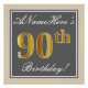 Este design simples e bolsa mensageifesta de aniversario elegante apresenta uma mensagem personalizada como "ANameHere's 90 Birthday!" (com o "90" a ter uma aparência falsa/imitada de cor dourada) dentro de uma área quadrada colorida de cinza com um contorno de fronteira simples. O nome está em um texto elegante, de cor branca, parecido com script, e pode ser personalizado. Uma poster personalizada como esta poderia talvez ser usada como decoração em uma festa para alguém que comemora seu nonagésimo aniversário. [~Z0000241]