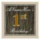 Este design simples e bolsa mensageifesta de aniversario elegante apresenta uma mensagem personalizada como "primeiro aniversario de ANameHere!" (com as "1ruas" com aparência falsa/imitação de cor dourada) dentro de uma área quadrada de aparência rústica/imitação de madeira apresentando um contorno de fronteira simples. O nome está em um texto elegante, de cor branca, parecido com script, e pode ser personalizado. Uma poster personalizada como esta poderia talvez ser usada como decoração em uma festa para alguém que comemora seu primeiro aniversário. [~Z0000233]