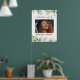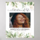 Cartaz de boas-vindas de funeral em espuma com uma grande foto da pessoa que você está lembrando, elegantes folhas botânicas de eucalipto verde em aquarela, detalhes florais em dourado, o nome dela e as datas de nascimento e morte.