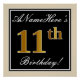 Este design simples e bolsa mensageifesta de aniversario elegante apresenta uma mensagem personalizada como "ANameHere's 11 Birthday!" (com o "11" a ter uma aparência falsa/imitada de cor dourada) dentro de uma área quadrada de cor preta com um contorno de fronteira simples. O nome está em um texto elegante, de cor branca, semelhante a script, e pode ser personalizado. Uma poster personalizada como esta poderia talvez ser usada como decoração em uma festa para alguém que comemora seu décimo primeiro aniversário. [~Z0000236]