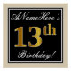 Este design simples e bolsa mensageifesta de aniversario elegante apresenta uma mensagem personalizada como "ANameHere's 13 Birthday!" (com o "13" a ter uma aparência falsa/imitada de cor dourada) dentro de uma área quadrada de cor preta com um contorno de fronteira simples. O nome está em um texto elegante, de cor branca, parecido com script, e pode ser personalizado. Uma poster personalizada como esta poderia talvez ser usada como decoração em uma festa para alguém que comemora seu décimo terceiro aniversário. [~Z0000236]