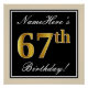 Este design simples e bolsa mensageifesta de aniversario elegante apresenta uma mensagem personalizada, como "NameHere's 67th Birthday!" (com o "67º" a ter uma aparência falsa/imitada de cor dourada) dentro de uma área quadrada de cor preta com um contorno de fronteira simples. O nome está em um texto elegante, de cor branca, semelhante a script, e pode ser personalizado. Uma poster personalizada como esta poderia talvez ser usada como decoração em uma festa para alguém que comemora seu sexagésimo sétimo aniversário. [~Z0000236]