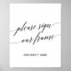 Este elegante quadro de caligrafia preta para assinatura é perfeito para um casamento simples. O design neutro apresenta um pôster minimalista decorado com tipografia romântica e caprichosa. O quadro diz "por favor, assine nosso quadro e mantenha-o comportado!"