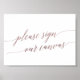 Esta elegante caligrafia rosa dourada, por favor assine nossa placa de canvas é perfeita para um casamento simples. A design cor-de-rosa-pincelada apresenta uma poster minimalista decorada com tipografia de folha de ouro rosa-falso romântica e caprichosa. Nota: Este design não apresenta folha de ouro rosa real. É um gráfico de alta qualidade feito para se parecer com folha de ouro rosa.