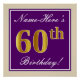 Este design simples e bolsa mensageifesta de aniversario elegante apresenta uma mensagem personalizada, como "Name-Here's 60th Birthday!" (com o "60º" a ter uma aparência falsa/imitada de cor dourada) dentro de uma área quadrada de cor roxa com um contorno simples de fronteira. O nome está em um texto elegante, de cor branca, parecido com script, e pode ser personalizado. Uma poster personalizada como esta poderia talvez ser usada como decoração em uma festa para alguém que comemora seu sexagésimo aniversário. [~Z0000238]