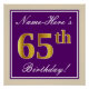 Este design simples e bolsa mensageifesta de aniversario elegante apresenta uma mensagem personalizada, como "Name-Here's 65th Birthday!" (com o "65º" a ter uma aparência falsa/imitada de cor dourada) dentro de uma área quadrada de cor roxa com um contorno simples de fronteira. O nome está em um texto elegante, de cor branca, parecido com script, e pode ser personalizado. Uma poster personalizada como esta poderia talvez ser usada como decoração em uma festa para alguém que comemora seu sexagésimo quinto aniversário. [~Z0000238]