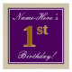 Este design simples e bolsa mensageifesta de aniversario elegante apresenta uma mensagem personalizada como "primeiro aniversario do nome-aqui!" (com as "1ruas" com aparência falsa/imitação de cor dourada) dentro de uma área quadrada de cor roxa com um contorno simples de borda. O nome está em um texto elegante, de cor branca, parecido com script, e pode ser personalizado. Uma poster personalizada como esta poderia talvez ser usada como decoração em uma festa para alguém que comemora seu primeiro aniversário. [~Z0000238]