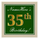 Este design simples e bolsa mensageifesta de aniversario elegante apresenta uma mensagem personalizada como "NameHere's 35th Birthday!" (com o "35º" com um aspecto de cor dourada falsa/imitação) dentro de uma área quadrada verde com um contorno de fronteira simples. O nome está em um texto elegante, de cor branca, semelhante a script, e pode ser personalizado. Uma poster personalizada como esta poderia talvez ser usada como decoração em uma festa para alguém que comemora seus trinta e cinco anos. [~Z0000235]