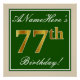 Este design simples e bolsa mensageifesta de aniversario elegante apresenta uma mensagem personalizada, como "ANameHere's 77th Birthday!" (com o "77º" a ter uma aparência falsa/imitada de cor dourada), dentro de uma área quadrada verde com um contorno simples de fronteira. O nome está em um texto elegante, de cor branca, parecido com script, e pode ser personalizado. Uma poster personalizada como esta poderia talvez ser usada como decoração em uma festa para alguém que comemora seus setenta e sete anos. [~Z0000235]