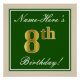 Este design simples e bolsa mensageifesta de aniversario elegante apresenta uma mensagem personalizada, como "Name-Here's 8th Birthday!" (com o "8º" a ter uma aparência de cor dourada falsa/imitada), dentro de uma área quadrada verde com um contorno de fronteira simples. O nome está em um texto elegante, de cor branca, parecido com script, e pode ser personalizado. Uma poster personalizada como esta poderia talvez ser usada como decoração em uma festa para alguém que comemora seu oitavo aniversário. [~Z0000235]