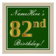 Este design simples e bolsa mensageifesta de aniversario elegante apresenta uma mensagem personalizada como "NameHere's 82nd Birthday!" (com o "82º" com um aspecto de cor falsa/imitação em forma de ouro) dentro de uma área quadrada de cor verde com um contorno de fronteira simples. O nome está em um texto elegante, de cor branca, semelhante a script, e pode ser personalizado. Uma poster personalizada como esta poderia talvez ser usada como decoração em uma festa para alguém que comemora seu oitenta segundo aniversário. [~Z0000235]