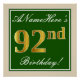 Este design simples e bolsa mensageifesta de aniversario elegante apresenta uma mensagem personalizada como "ANameHere's 92nd Birthday!" (com o "92º" com um aspecto falsa/imitado de cor dourada) dentro de uma área quadrada de cor verde com um contorno de fronteira simples. O nome está em um texto elegante, de cor branca, semelhante a script, e pode ser personalizado. Uma poster personalizada como esta poderia talvez ser usada como decoração em uma festa para alguém que comemora seu nonagésimo segundo aniversário. [~Z0000235]